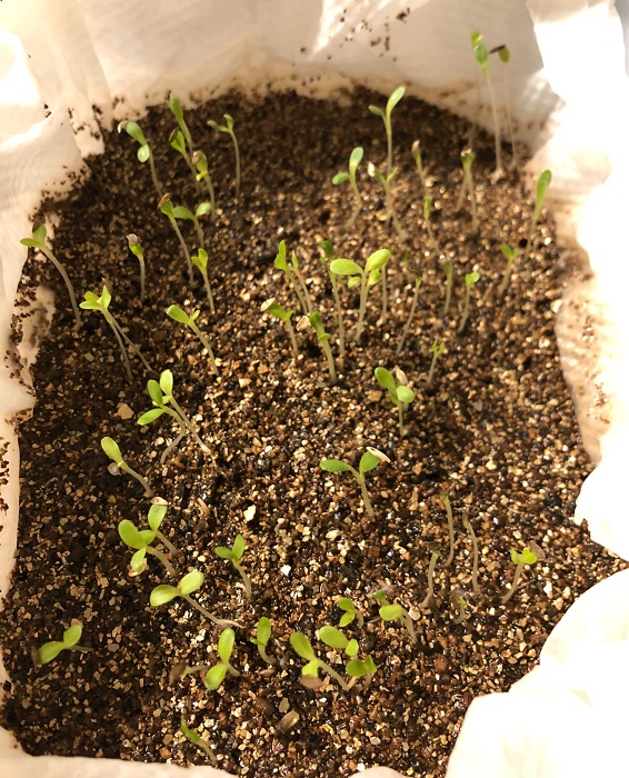 野菜蒸し用のうちザル付き容器があったので、それにキッチンペーパーを敷いて、以前ミニトマト用に買っていたバーミキュライトを用意して種をバラまき。