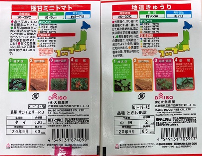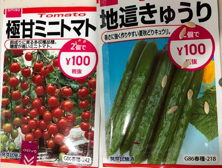 ミニトマトがなかなか開花しなくて打ちひしがれていた梅雨真っただ中の2020年7月、今から植えると秋取りきゅうりになるという情報を仕入れたので、ダイソーに駆け込んできました。