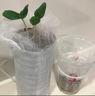 余っていた水切りネットに余っていたバーミキュライトと紙コップで発芽させました。