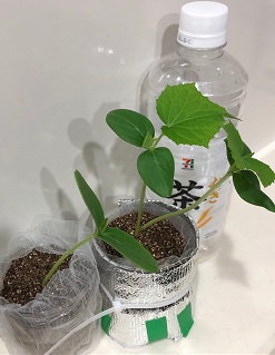茎にスポンジ巻いてペットボトルに挿す方法だと、中に頻繁にスポンジごと苗が落下してしまって困っていたので、水切りネットにバーミキュライト入れてペットボトルに入れたら落ちないのではという試行。