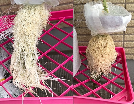 満水にしてしまうと右のように根っこが上の方しか育たないから、気持ち少なめの方が良さそう。