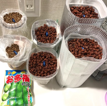 育苗にちょうどいいアイテムを切らしていたので、容器はペットボトルです。