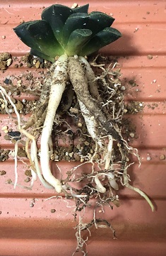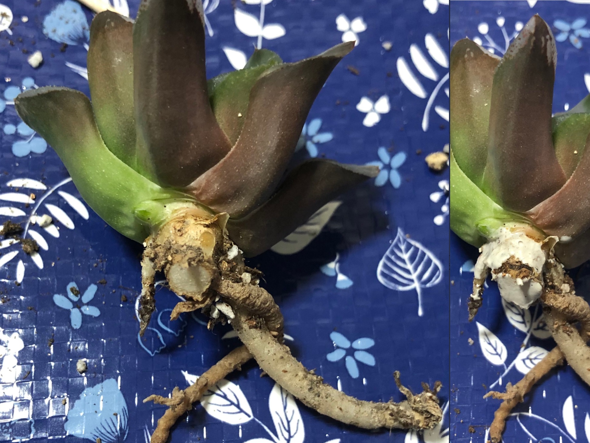 来た時(左)から株に対して根がないなと思ってたドドソン紫オブツーサ、抜いてみたら(右)、まあ相変わらずな感じだったので逆に大丈夫かなという感じです。