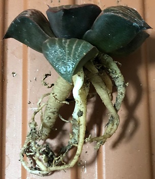 アトロフスカミュータントは根っこの中身ないんですけどどういうことなの……葉の隙間から根っこ出てきてたので、葉をもいで古い根っこ取って削って発根剤塗布。